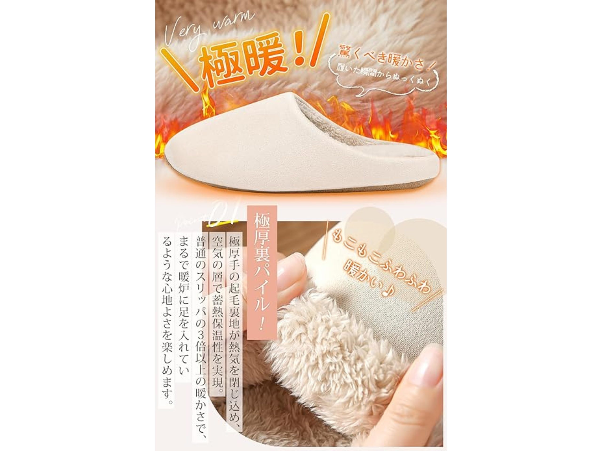 超人気の「ふわふわスリッパ」。裏地の起毛が熱気を閉じ込め、空気の層を作って蓄熱保温。あたたかさは普通のスリッパの3倍以上とも!
