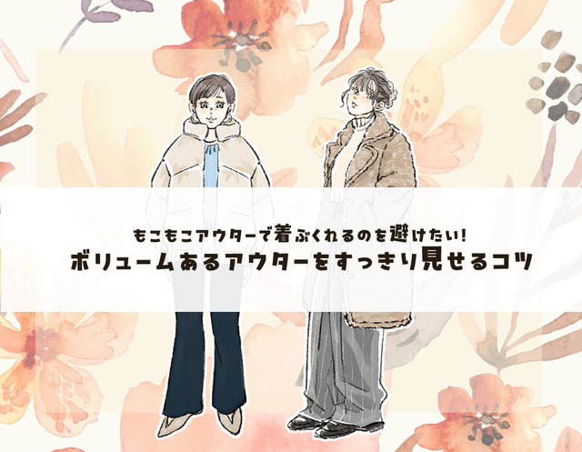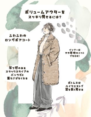 今回はダウンコート・ボアコートの2タイプのボリュームアウターの着こなし方についてご紹介いたしました。これらは上半身にボリュームが出やすいため、顔まわりをコンパクトにまとめることでよりスッキリして見えます。たとえば、髪の毛も巻き下ろしよりは、まとめ髪のほうがバランスが取れます。他、視線を顔に集中させるためのメガネやアクセサリーを一つプラスすると、全身で見た時のコーディネートバランスがさらに良くなるので、顔まわりの見せ方について意識してみてくださいね。