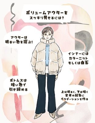今回は、ボリュームアウターを代表する2大コートの「ダウンコート」と「ボアコート」でスッキリ細く見えるコーディネートテクニックについてご紹介いたします。