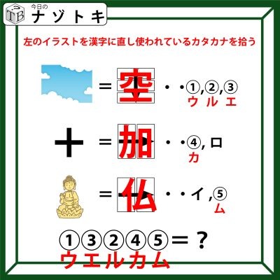 さらに、それを真ん中の部特区で分けてみるとそれぞれがカタカナになっており、「空」なら「ウ」、「ル」、「エ」となります。「加」なら「カ」「ロ」、「仏」なら「イ」「ム」です。