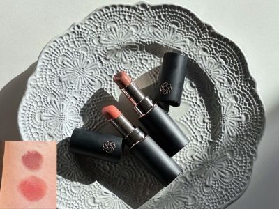 13G my theoryは、品のよいローズベージュ。赤みの強い筆者の唇に塗ると、コーラルっぽい発色になり、華やかな印象に仕上がります。25G mauve beigeは、赤みを抑えたモーヴベージュ。控えめな印象ながら色っぽい口元に仕上がります。