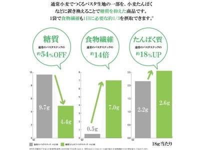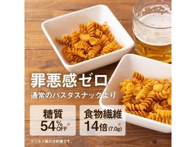 低糖質なのに加えて、食物繊維がめっちゃ多いのも注目! お酒によく合うパリパリ食感のパスタスナック。ほかにトマト味、コンソメ味もあって、味バリエ豊富