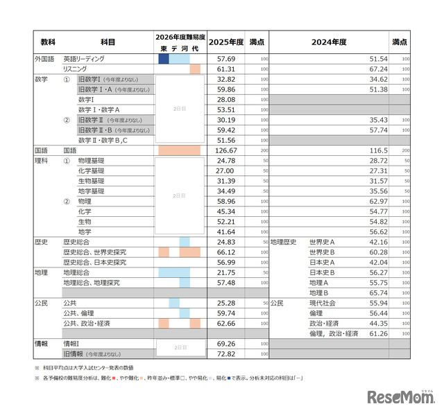 大学入試センターが発表している過去2年の共通テスト平均点(最終)の推移と、1月18日正午時点で公開されている各予備校の2026年度共通テスト難易度分析をあわせて、表にまとめた。今後、予備校のWebサイトで追加・修正される可能性がある。