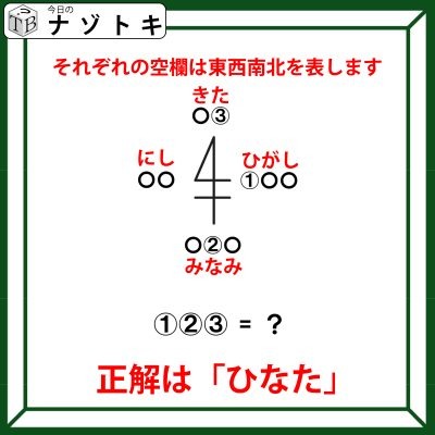 したがって、空欄に入る言葉はそれぞれの方角ということになります。実際に埋めてみると上図のようになりますので、あとはこれを数字順に文字を拾ってみましょう。正解は「ひなた」でした。