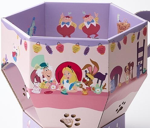 この度発売となるのは、『ふしぎの国のアリス』に登場するティーパーティーのシーンをデザインした、段ボール製のティーカップ型爪とぎ(税込5,990円)。商品の外側だけでなく内側にも映画の主人公・アリスやマッドハッター、三月うさぎ、チェシャ猫などの多くの人気キャラクターが描かれている。