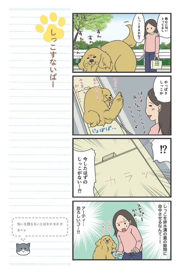 排水溝のすきまに吸い込まれた?! 恐るべし、愛犬の消えたしっこ事件…【おさんぽですし! おしゃべり犬とイライラ猫の日記 #15】 | NewsCafe