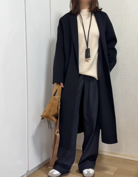 冬の装いを知的で落ち着いた印象にまとめたいときは、kaoriii_1012さんのようなネイビーを主役にした配色が参考になります。全体をダークトーンで統一しつつ、インナーに明るいベージュのニットを差し込むことで、顔まわりがパッと明るく引き立ちます。注目のボトムスには、ユニクロの「タックワイドパンツ(ストライプ)」3,990円(161cmでサイズL着用)をセレクト。縦のラインを強調するストライプ柄が、脚をすっきりと長く見せてくれます。