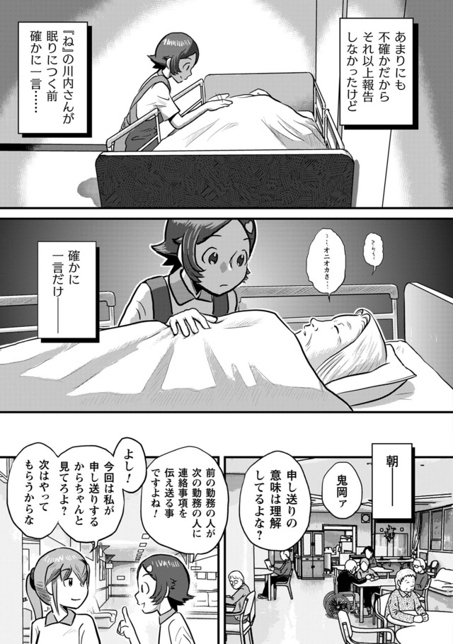 鬼岡明(おにおか めい)は、なかなか就職先が見つからず苦労していたが、とあることがきっかけで介護施設の認知病棟で働き始めることとなる。