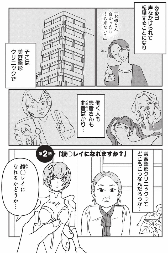 「社割で美容代がお得になる」という甘い言葉に惹かれて働き始めたものの、待っていたのは顔面ギプス姿の先輩や、アニメキャラの顔を目指す患者、社長が連れてくる大量のキャバ嬢たち……。