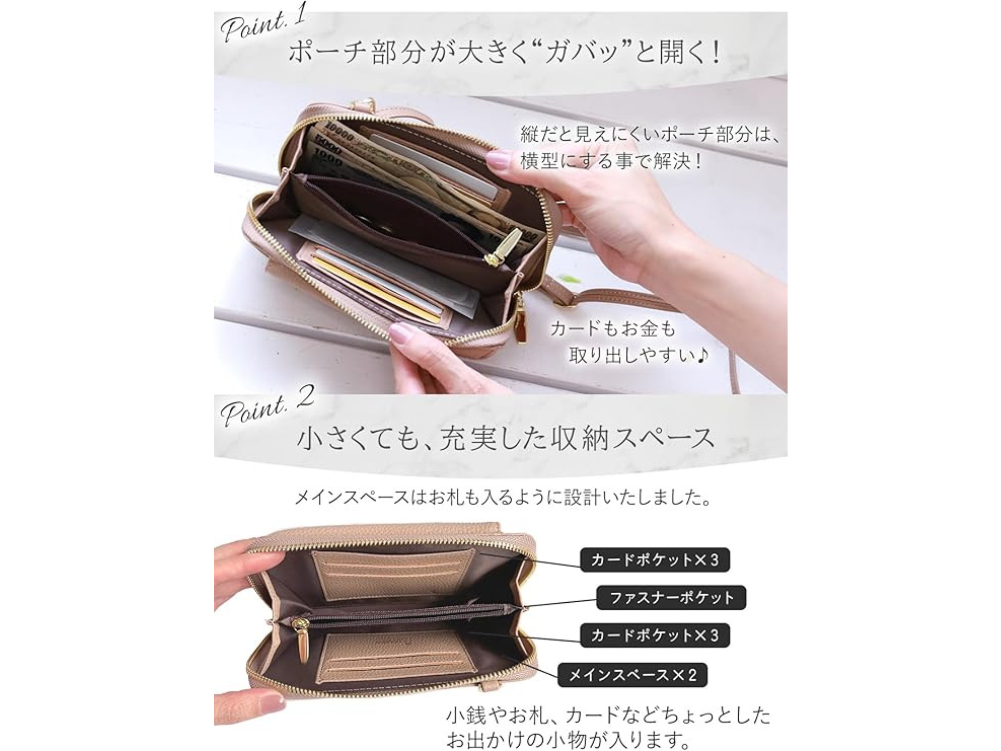 「ショルダー財布」としての機能も充実! ガバッと開いて中身が見やすい、横開きのポーチ。収納もいっぱいなのに140gなのは軽い~♪