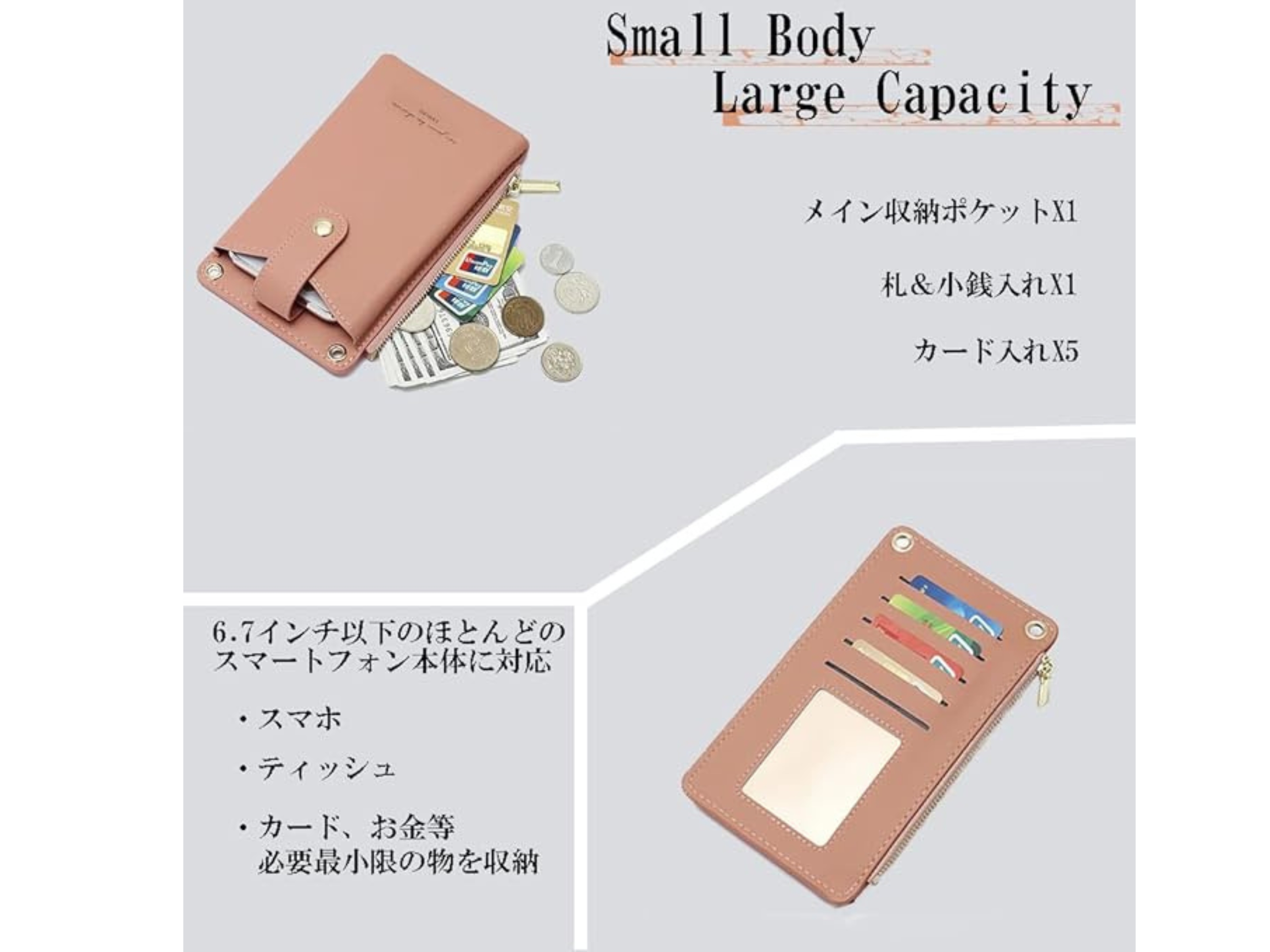 色や質感の異なるバリエが豊富で人気。スマホが入るポケットのほか、お札&小銭入れ、5枚のカードを収納できるポケットつきで50%OFF中!