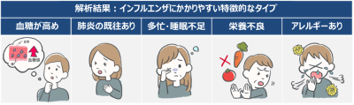血糖、呼吸器、睡眠、栄養、アレルギーといった具体的な特徴が重なったときに、よりインフルエンザにかかるリスクが高まると考えていいでしょう。