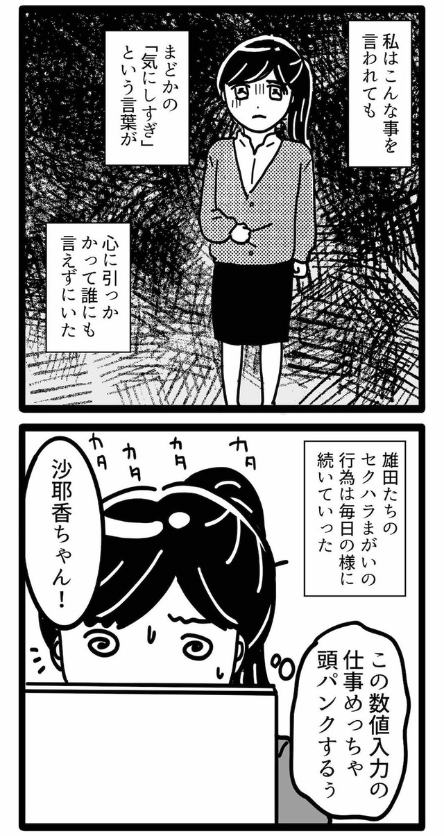 新卒で大手企業に就職した沙耶香は、上司や男性社員からひどいセクハラを受ける。