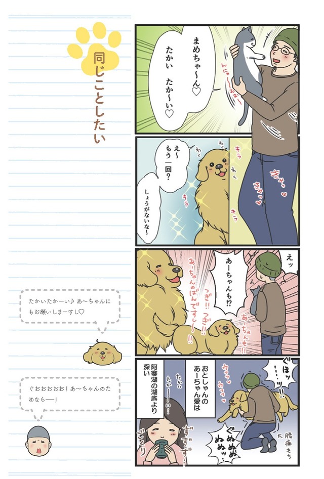 「たかい、たか〜い」猫と同じ遊びを望む大型犬…飼い主の愛はどこまで深い?!【おさんぽですし! おしゃべり犬とイライラ猫の日記 #25】 | NewsCafe