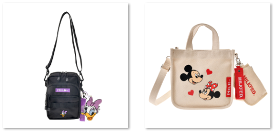 デイジーの刺しゅうを施したショルダーバッグや、ミッキーマウス&ミニーマウスをデザインしたトートバッグも必見だ。
