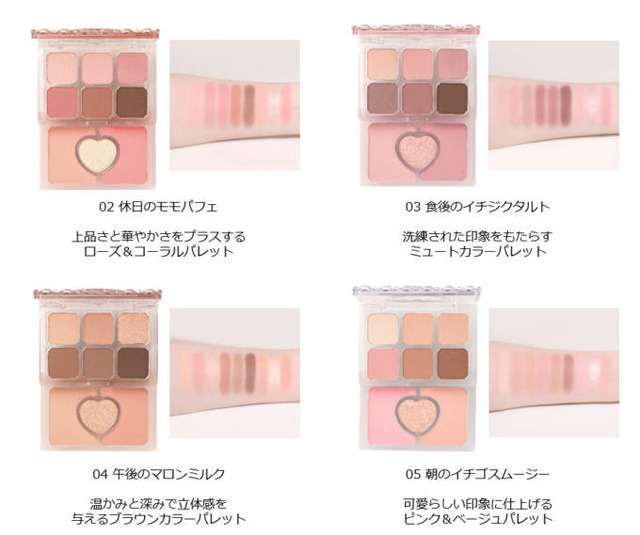 肌なじみのよいテクスチャーがやわらかく密着し、甘い彩りを与えるパレット。マット・マットラメ・シマーと異なる質感を組み合わせ、単色使いもグラデーションも自在に楽しめる設計となっている。