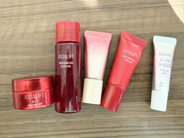 アスタリフト ジェリー アクアリスタ 7g、アスタリフト アドバンスドローション 14mL、アスタリフト ザ セラム マルチチューン 5mL(医薬部外品)、アスタリフト アドバンスドクリーム 7g、アスタリフト D-UVシールド トーンアップ ローズ [SPF50 ・PA ] 4g
