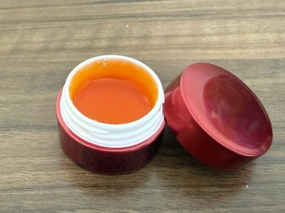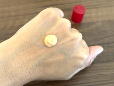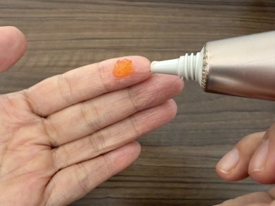 目にも鮮やかなぷるんぷるんの赤いジェル、手に取ったときは「思ったよりしっかりめ」という印象。そう、このジェルはすでに5代目ですから、私が最初に使用したときより進化しているんですね。ジェルの場合、柔らかすぎると、顔に塗る前に手のひらで溶けてしまうことがあるので、このくらいが扱いやすくてちょうどいいと再認識。