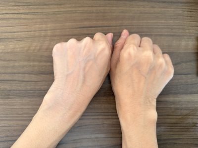右側がスッピンの腕、左側が「D-UVシールド トーンアップ ローズ」を塗った腕。透明感と明るさの違いがお分かりいただけると思います!