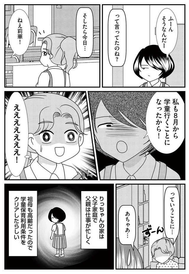 ある日、入学説明会でひとりで参加していた父子家庭の同級生・りつが気になり、親切心からその子に手を差し伸べる。