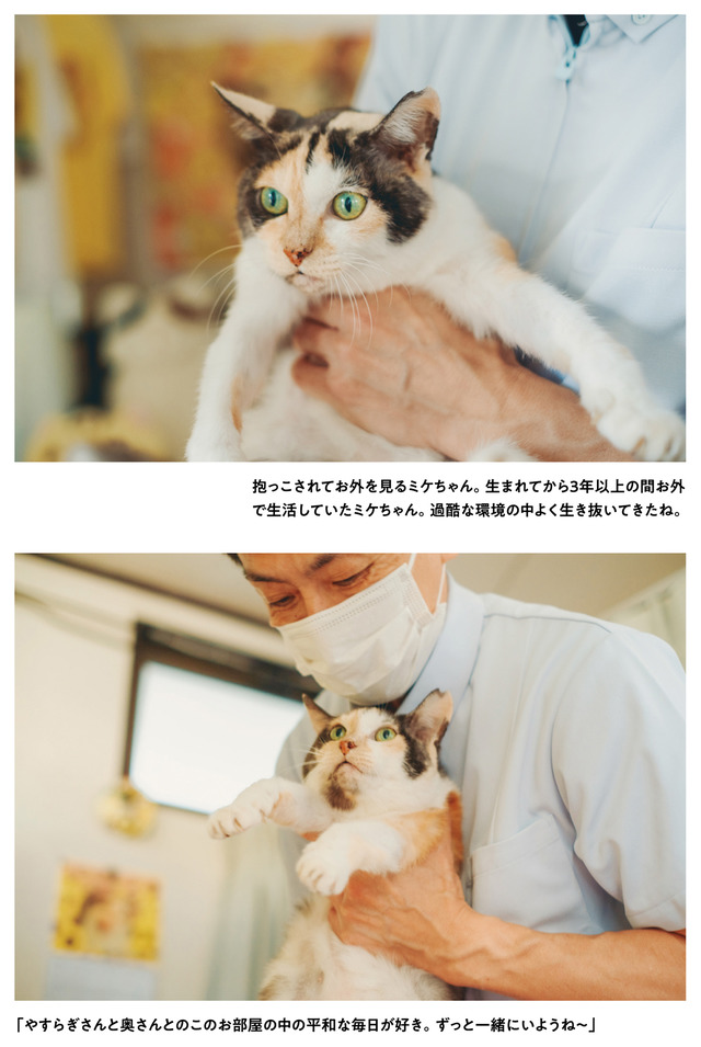生まれつき後ろ足が一本ない野良猫のミケちゃんは、嵐の夜をきっかけに院長のやすらぎさんの店猫として暮らすようになりました。