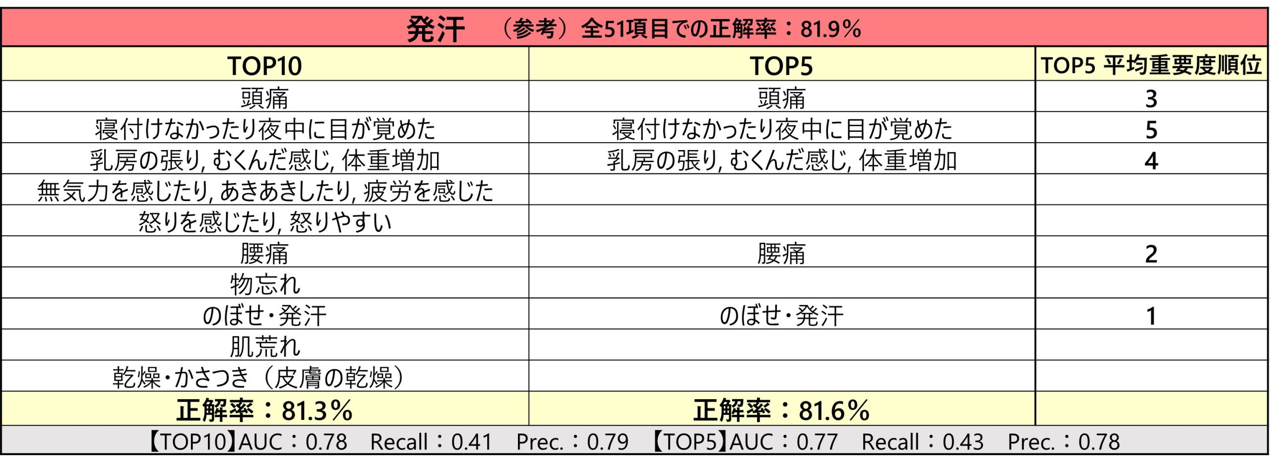 「予測したかったリスク症状は代表的な6つの更年期症状、イライラだるさ頭痛落ち込み・不安発汗肩こりです。これらの症状に対して、『冷え』『吐き気』『腰痛』など51項目の質問を選び、機械学習で寄与度の高いTOP10、TOP5の項目を選び出してそれぞれの正解率を算出しました。結果的に、6つの更年期症状は18項目のPMS症状から予測できることを見出しました」