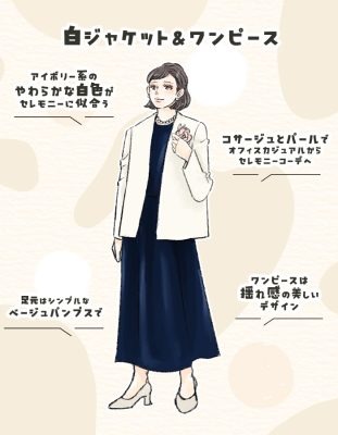 オフィスカジュアルにも使える服装でセレモニーコーデを完成させたい時に欠かせないのが、白のジャケット。やはり、「白」という色は祝い事にぴったりの色です。とくに視線を集める上半身であるジャケットに白をプラスすることで、普段使っているお仕事着用のワンピースも華やかさが出てきます。