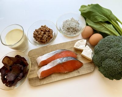 とったカルシウムを骨にしっかり届ける働きがあります。納豆やほうれん草、ブロッコリーなどを中心に、1日250μg以上を意識してとりましょう。