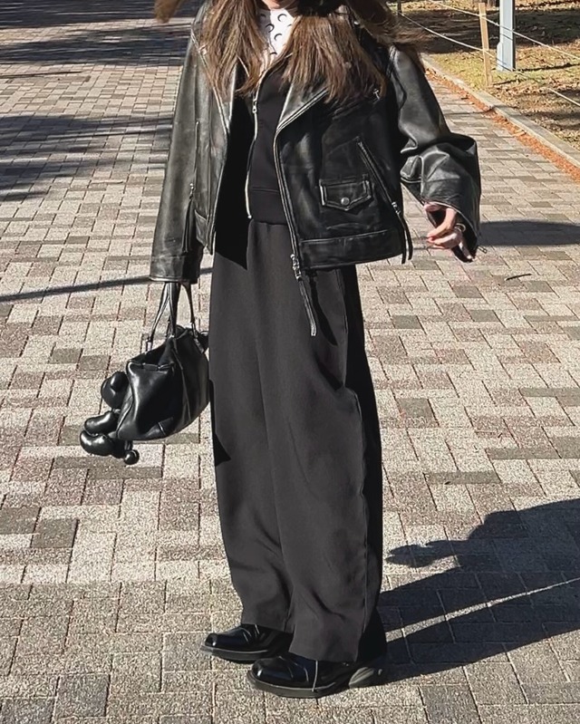トップスにはコンパクトな黒のインナーを合わせ、上から無骨なレザージャケットを羽織ることで、上下のボリュームバランスを絶妙に整えているのがポイントです。全体を黒で統一しつつ、インナーの首元から白をのぞかせることで、顔周りに明るさと抜け感が生まれます。足元には光沢のあるブーツを合わせ、素材感の違いで奥行きを出せば、都会的で凛としたスタイルが完成しました。