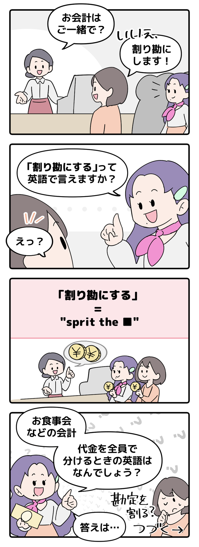 「英語嫌いな日本人をなくしたい!」海外生活や添乗員経験、そしてバイリンガル子育て中の英会話講師・Mrs.服部が、身近な英語表現を漫画&クイズ形式でお届け! 「間違ったら恥ずかしい」じゃなく「伝わればOK」。使えるフレーズをマンガで学びましょう!