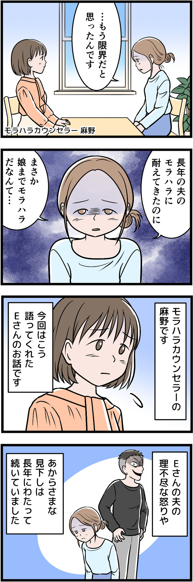 夫婦問題・モラハラカウンセラーの麻野祐香先生の原作による本シリーズ、今回は「モラハラ夫の側近のようになってしまった長女」に苦しんだEさんのお話をお届けします。