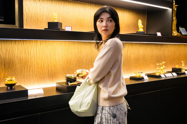 物語は、平凡な日常に行き詰まりを感じていた専業主婦の美香子(田中麗奈)が、立ち寄った百貨店でつい“金のおりん”を盗んでしまう所から物語が動き出す。普通であることが幸せと言い聞かされ育った美香子は、どんなに退屈な日々にも自分に無関心な家族にもやりすごしていた。だが、金に魅了され世界は一変し、「私にしかできないことをする」という幼き日の夢が蘇り、100億円の秀吉の金茶碗を盗む計画を企てることになる。この度解禁された本編映像では、主人公の美香子が金に魅せられ一世一代の大博打に出るきっかけになった、金のおりんと出会う場面が収められている。味気ない日々を感じながらも、犯罪とは無縁の世界で生きてきた美香子。しかし、何かに引き寄せられるかのように立ち寄った黄金展にて、金のおりんと出会う。音を鳴らしてみると暗示をかけるかのように鳴り響く音色。周りに誰もいないことに気づき、おりんを見つめる美香子の姿が映し出されている。