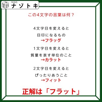 まずは問題文から3つの単語が何かを考えてみましょう。そうするとそれぞれの単語は上から「フラッグ」「カラット」「フィット」であることが分かります。カラットとは宝石等によく使われますね。
