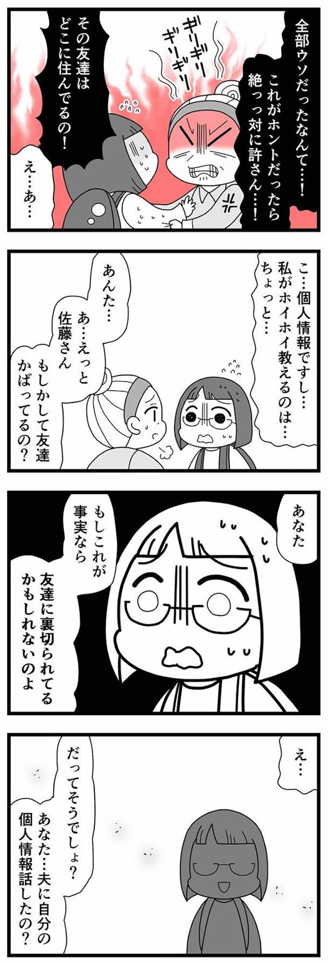 真相を確かめるため、正子は妻とともに親友とその彼を問いただすことにしたのだが――。