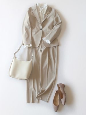 午前中に入学式に出席して午後からお仕事へ行く忙しいママさんには、そのままお仕事に行けちゃうパンツのセットアップはいかがでしょうか。優しくみえるベージュのセットアップにフリルカラーのブラウスを合わせました。