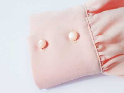ピンク×ネイビーは上品に見える組み合わせ。首元に立ち上がりのあるブラウスにワイドパンツを合わせました。ブラウスは細かな凹凸があり、体のラインを拾いにくいジョーゼット素材です。