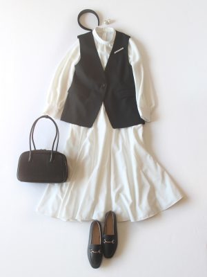 ワンピース風に上下をつなげて、ジレを合わせました。学校の雰囲気によると思いますが、私はこのくらいの雰囲気で卒業式も入学式も出ちゃいます!服がジャケットやセットアップでなくても、靴とバッグの色を揃えて、カチューシャやブローチなどの小物で盛ればきちんとした印象になります。