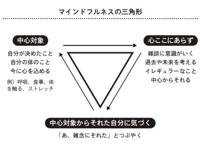 目を閉じたほうが「触れている感触」に意識を向けやすいのであれば、目を閉じて感じてもいいでしょう。マインドフルネスの三角形(下図)を意識して、「触れている感触」を中心対象に置いて、気が散ってもOKという気持ちで「触れている感触」に戻りながら味わってみてください。