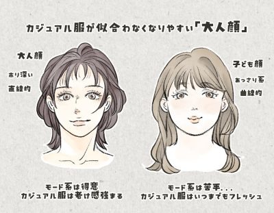 それは、顔の掘りが深くなっていくことが原因です。もともと大人顔さん・キレイ系の方にとってカジュアルな服装は、顔だけが浮いて見えやすいのです。加えて、年齢によって、顔の造形が変化し、堀が深くなるため、ますますその違和感が大きくなっていきます。