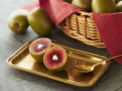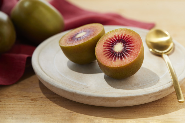 ゼスプリ ルビーレッドキウイは、ニュージーランドの国営研究機関・プラント&フードリサーチ社とゼスプリが共同で、約20年をかけて開発した品種。2020年から販売が始まった、ゼスプリの中で最も新しいキウイです。特徴はなんといっても、カットしたときに現れる宝石のような赤い果肉。この赤色は「アントシアニン」というポリフェノール成分によるもので、見た目の美しさだけでなく、健康・美容面でも注目される成分です。