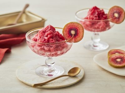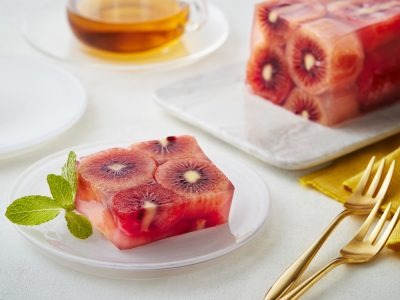 「ルビーレッドキウイの赤い果肉の美しさやベリーのような味わいを活かしたレシピは、おもてなしやご褒美スイーツに最適です。贅沢な甘さが特徴で、砂糖を控えめにしても満足感のある味わいに仕上がります。赤い断面を活かした“見せる”断面スイーツにぴったりです。皮をむいてそのまま使える手軽さも魅力で、季節感と希少感を演出できる主役級フルーツです。加熱しないことで豊富なビタミンCを効率よく摂れるメニューに仕上げています」(藤井恵先生)