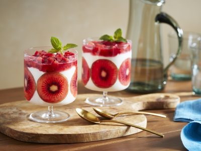 ルビーレッドキウイの美しい赤い果肉は、スイーツの主役としても抜群の存在感を発揮します。管理栄養士・料理研究家の藤井恵先生による3レシピは、どれも「加熱なし」で仕上げるのがポイント。