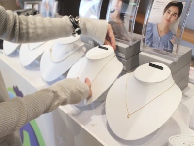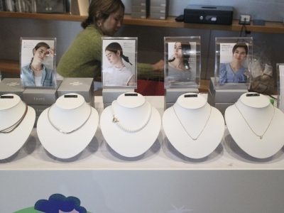 リエリィのブランドコンセプトは「MagneLife Therapy(マグネライフ・セラピー)」。磁気のチカラで血流改善、コリ緩和を目的とするアイテムを展開しています。ご自愛市のリエリィのブースには試着ができるネックレスのサンプルが展示されていました。