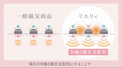 25年以上もの研究の中で、磁石のN極とS極を交互に配列し、磁力をつなげることでより効率的に血行改善が促進されることが明らかになっているそうです。 リエリィのネックレスはこの知見をもとに、磁力の効果を最大化する配列が採用されています。