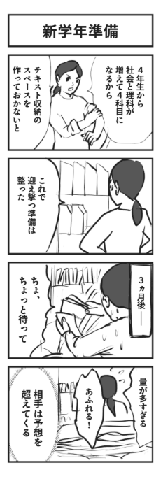 ――なるほど。分類が苦手な身としては、床の箱に直置き派もいると知って安心しました。漫画でも、息子のさい君が「合格体験記でプリントタワーの前でイェーイってやりたい」と言っていて、「かわいいなぁ」と癒やされました!