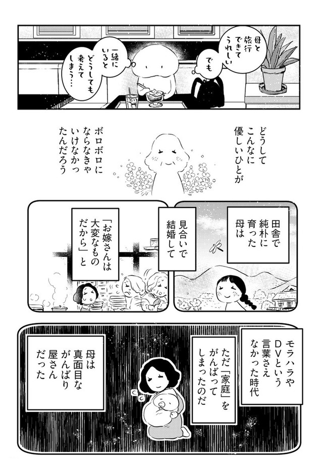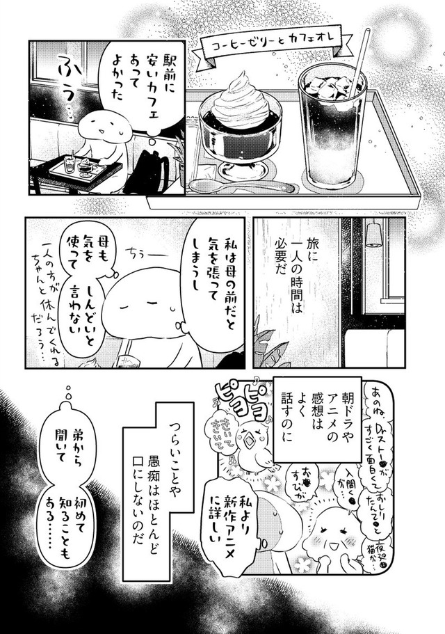 年間に何度も旅する漫画家の“私”が、旅慣れない母を連れて向かったのは関東への二人旅。壊れたサンダルで現れる母に始まり、行く先々でハプニング続出。