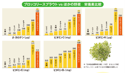 スルフォラファンと超硫黄分子、ブロッコリースプラウトの強みはこれだけではありません。特に、活性酸素を無害化するビタミンの宝庫としても注目されています。ブロッコリースプラウトとほかの野菜を比較しても、ビタミンCはほうれん草や小松菜の2倍近く、βカロテンはトマトの2.5倍も含まれています。