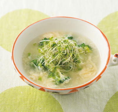 とろとろの卵がやさしく、喉越しの良いスープ。ブロッコリースプラウトの緑が彩りを引き立て、シャキシャキ食感がアクセントに。忙しい朝の栄養補給にもぜひ!