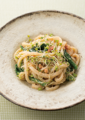 明太マヨのコクがうどんに絡み、小松菜の程よい苦味とブロッコリースプラウトのシャキシャキ感が旨味を底上げ。スプラウトの爽やかさと風味が相まって、食べ飽きることがありません。