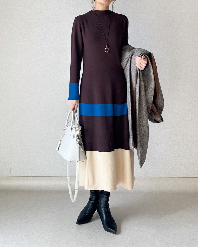 ブラウンをベースにブルーやベージュのラインを効かせた、akokakoさんのモダンなニットワンピースコーディネート。首元が詰まったハイネックのデザインがクラシカルな雰囲気を醸し出し、一枚でさらりと着るだけで洗練されたスタイルが完成します。手首や裾にあしらわれた鮮やかなカラーブロックが視線を分散させてくれるので、ロング丈でも重たくなりすぎず、全身のバランスが整いやすいのが魅力です。